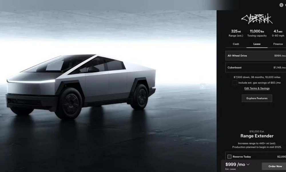Gần đây, website Tesla công bố giá thuê dành cho mẫu bán tải điện, giá khởi điểm 999 USD/tháng cho phiên bản AWD. Ở phiên bản Cyberbeast cấu hình 3 động cơ, giá thuê tăng lên thành 1.148 USD/tháng.