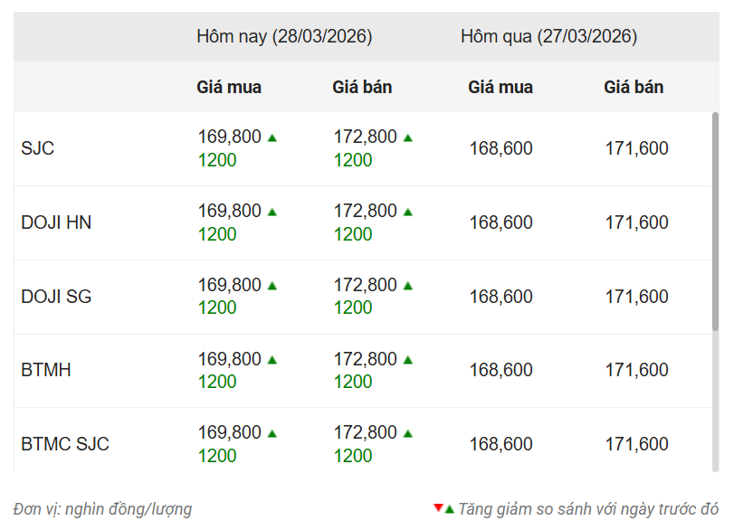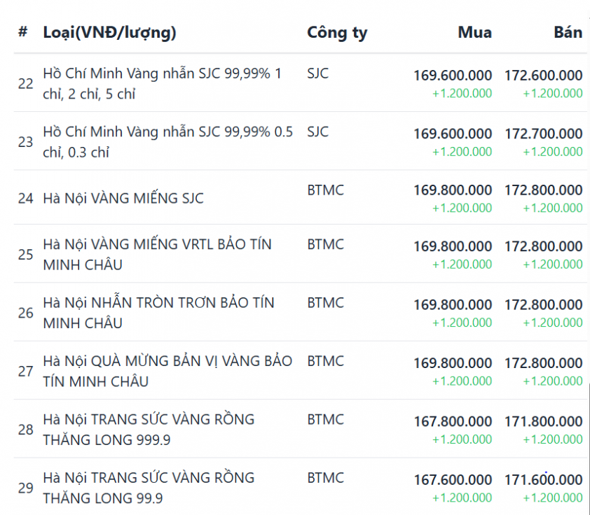 Tại hệ thống DOJI Hà Nội và DOJI Sài Gòn, giá vàng cũng chứng kiến mức tăng tương tự: 1,2 triệu đồng/lượng, hiện đạt mốc 169,8-172,8 triệu đồng/lượng (mua vào-bán ra).