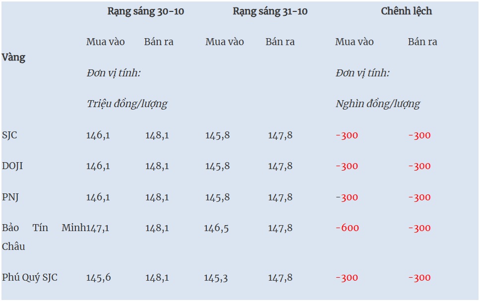 Giá vàng miếng trong nước cập nhật sáng 31-10 như sau: