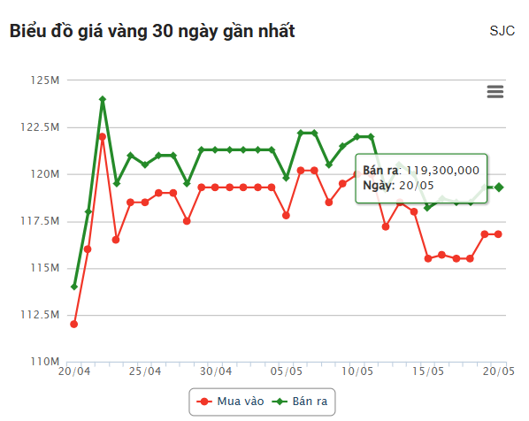 Giá vàng hôm nay ngày 20/5/2025 tính đến 14h20 tạm thời neo ngang ở mức dưới 120 triệu đồng/lượng, trong khi vàng nhẫn bất ngờ hạ giá.