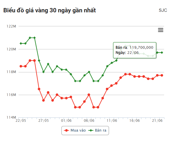 Giá vàng hôm nay 22/6/2025 tính đến 14h32 đã kết phiên ở mức 119,7 triệu đồng/lượng - tăng nhẹ trong ngày giao dịch gần nhất.