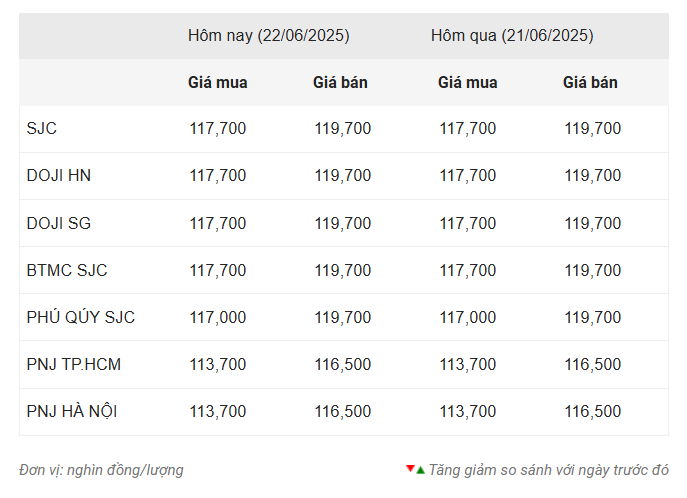 Tính đến 14h32 ngày hôm nay 22/6/2025, giá vàng miếng SJC và DOJI (HN, TPHCM) đã kết phiên ở mức 117,7 triệu đồng/lượng chiều mua vào và 119,7 triệu đồng/lượng chiều bán ra, tăng 300 nghìn đồng ở cả 2 chiều so với thời điểm cách đây 2 ngày.