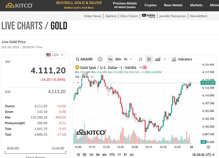 Giá vàng thế giới niêm yết trên Kitco ở mức 4111,20 USD/ounce, giảm 14,2 USD/ounce so với hôm qua. Vàng tương lai giao dịch lần cuối ở mức 4.118 USD/ounce.