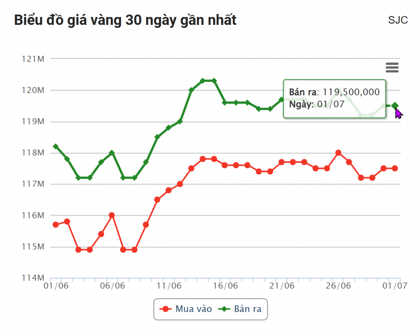 Tính đến 7h30 sáng ngày 1/7/2025, giá vàng miếng SJC tại ba hệ thống lớn SJC, DOJI và BTMC niêm yết ở mức 117,5 triệu đồng/lượng mua vào và 119,5 triệu đồng/lượng bán ra.