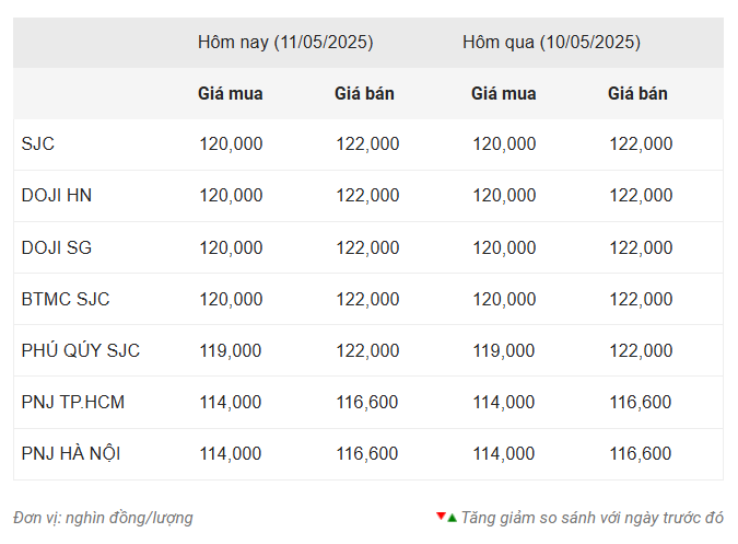Tính đến 7h46 ngày hôm nay 11/5/2025, giá vàng miếng trong nước đi ngang so với ngày hôm qua, tiếp tục duy trì ở ngưỡng cao tại các hệ thống lớn như SJC, DOJI (Hà Nội và TPHCM), Bảo Tín Minh Châu và Phú Quý. Theo đó, giá SJC, DOJI (Hà Nội và TPHCM) và BTMC SJC đồng loạt niêm yết ở mức 120 triệu đồng/lượng chiều mua vào và 122 triệu đồng/lượng chiều bán ra, tăng 500 nghìn đồng ở cả 2 chiều trên tương quan với lần điều chỉnh gần nhất.