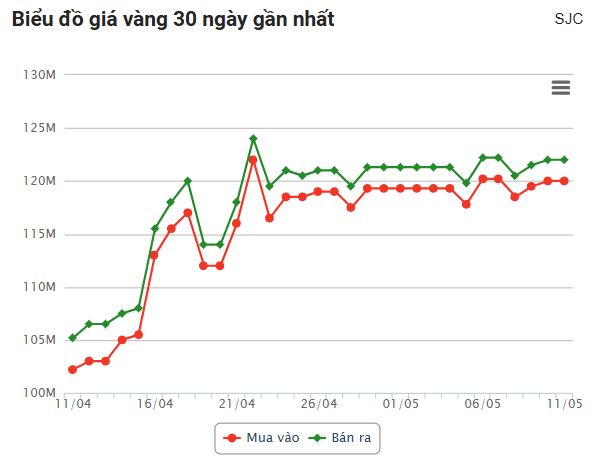 Giá vàng hôm nay ngày 11/5/2025, tính đến 7h46 tạm thời đi ngang, neo ở mức cao: 122 triệu đồng/lượng.