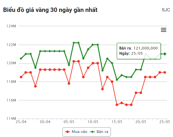 Giá vàng hôm nay ngày 25/5/2025 lúc 7h02 tạm thời đi ngang, tiếp tục trên mốc 120 triệu đồng/lượng.