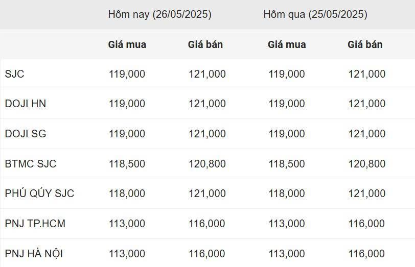 Tính đến 5h30 sáng nay (26/5/2025), giá vàng miếng trong nước vẫn duy trì ổn định, gần như không có biến động so với cuối tuần trước. Tại các hệ thống kinh doanh vàng lớn như SJC, DOJI ở cả Hà Nội và TP.HCM, giá mua vào tiếp tục được niêm yết ở mức 119 triệu đồng/lượng, trong khi giá bán ra đứng yên ở ngưỡng 121 triệu đồng/lượng.