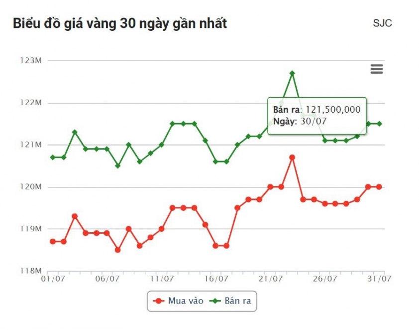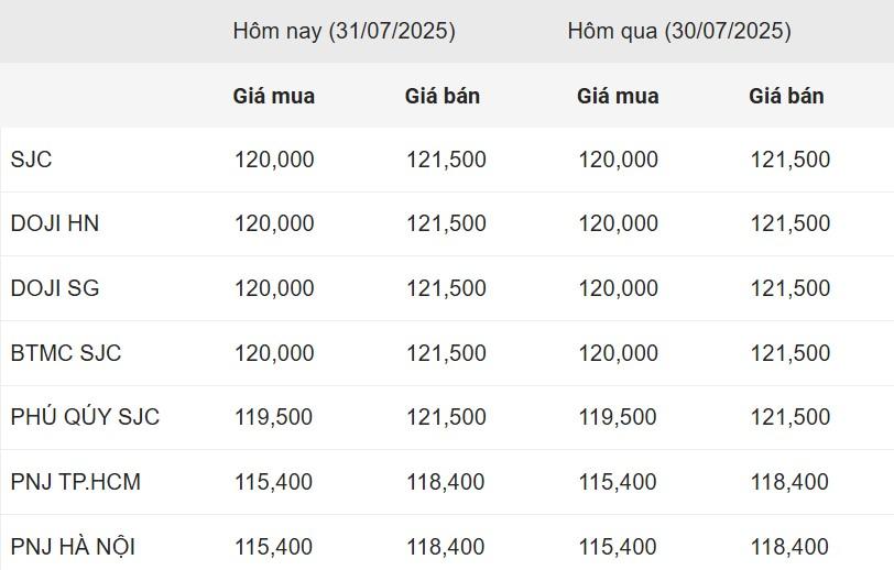 Ghi nhận lúc 6h30 sáng 31/7, giá vàng miếng SJC tại các hệ thống lớn trên cả nước đồng loạt tăng mạnh, thêm 300.000 đồng mỗi chiều so với phiên liền trước. Hiện giá mua vào tại SJC, DOJI Hà Nội, DOJI Sài Gòn và Bảo Tín Minh Châu đều đạt mức 120 triệu đồng/lượng, trong khi giá bán ra vươn lên 121,5 triệu đồng/lượng.