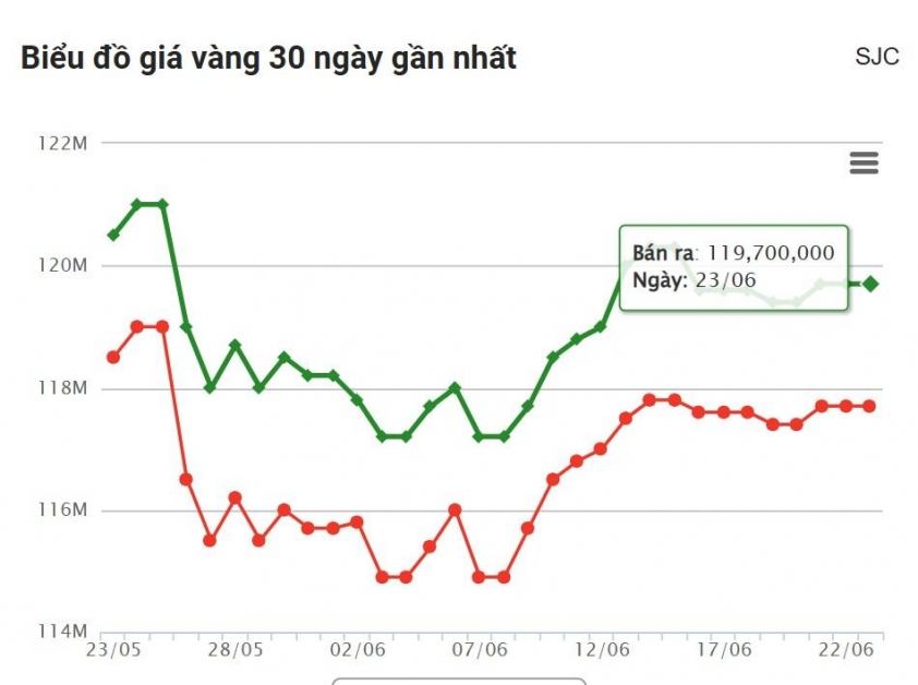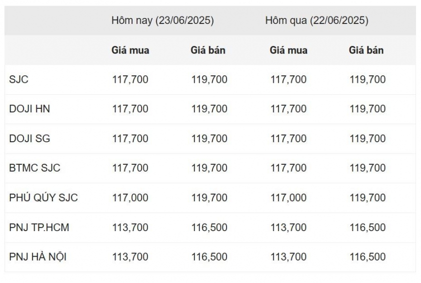 Tính đến 7h30 ngày 23/6/2025, giá vàng miếng SJC và DOJI tại Hà Nội và TP.HCM đang ở mức 117,7 triệu đồng/lượng (mua vào) và 119,7 triệu đồng/lượng (bán ra). Đây là con số giữ nguyên so với phiên giao dịch ngày hôm qua.