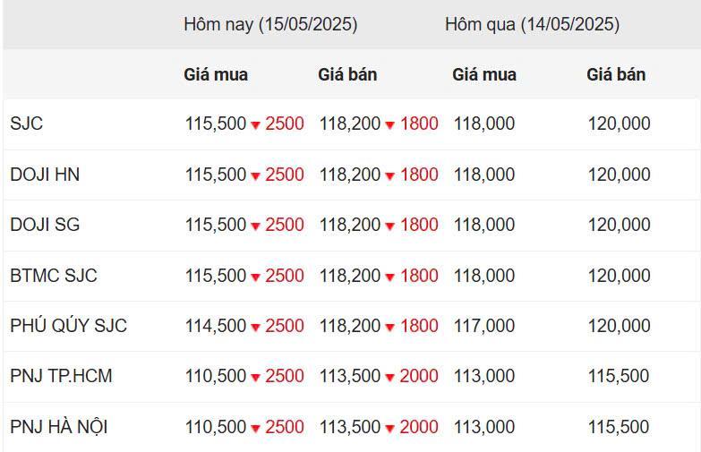 Cập nhật đến 18h ngày 15/5, giá vàng miếng tại các doanh nghiệp lớn giảm mạnh ở cả hai chiều mua – bán. Tại Công ty Vàng bạc Đá quý SJC, giá mua vào hiện đứng ở mức 115,5 triệu đồng/lượng, giảm tới 2,5 triệu đồng so với cùng thời điểm ngày hôm trước. Giá bán ra cũng hạ còn 118,2 triệu đồng/lượng, mất 1,8 triệu đồng.