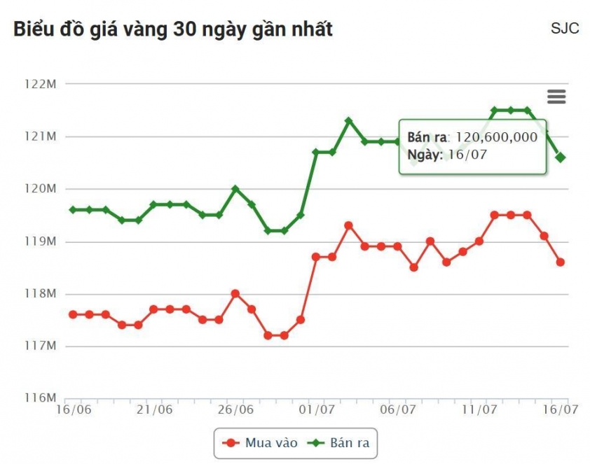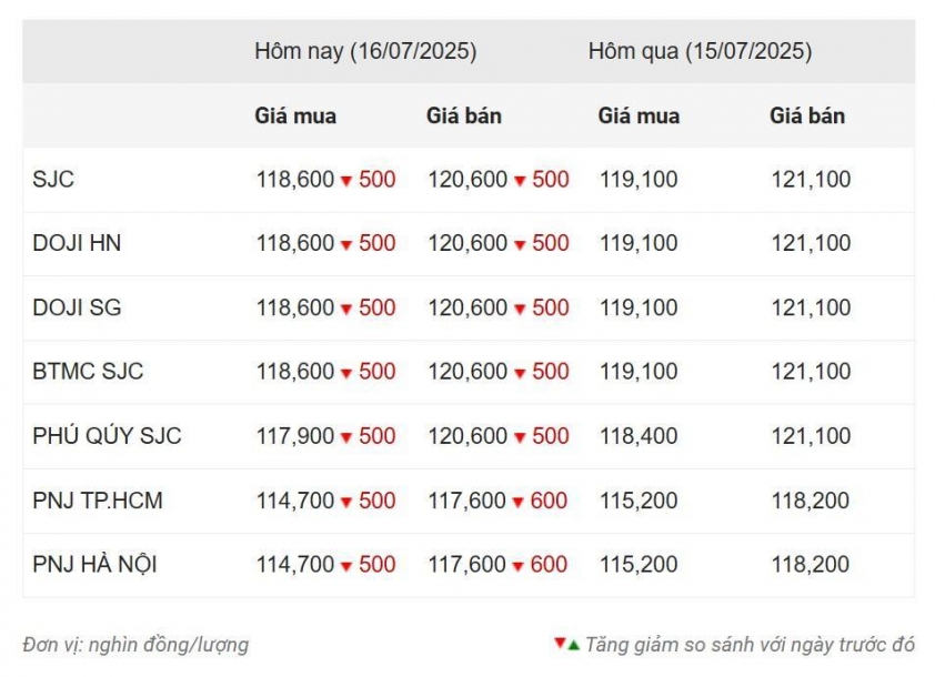 Tính đến 20h00 ngày hôm nay 16/7/2025, giá vàng miếng SJC và DOJI tại Hà Nội và TP.HCM đồng loạt giảm 500 nghìn đồng ở cả hai chiều mua vào và bán ra so với ngày hôm qua, hiện đang niêm yết ở mức 118,6 triệu đồng/lượng (mua vào) và 120,6 triệu đồng/lượng (bán ra). Đây đã là phiên giảm thứ hai liên tiếp của thị trường vàng trong nước sau một chuỗi tăng giá mạnh.