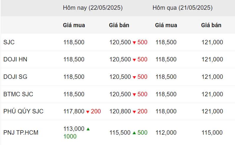 Cập nhật lúc 19h30 tối 22/5/2025, giá vàng miếng SJC tại các doanh nghiệp lớn như DOJI, SJC hay Bảo Tín Minh Châu (BTMC) ghi nhận việc giảm nhẹ so với phiên ngày hôm qua. Cụ thể, giá được niêm yết phổ biến ở mức 118,5 triệu đồng/lượng (mua vào) và 120,5 triệu đồng/lượng (bán ra).
