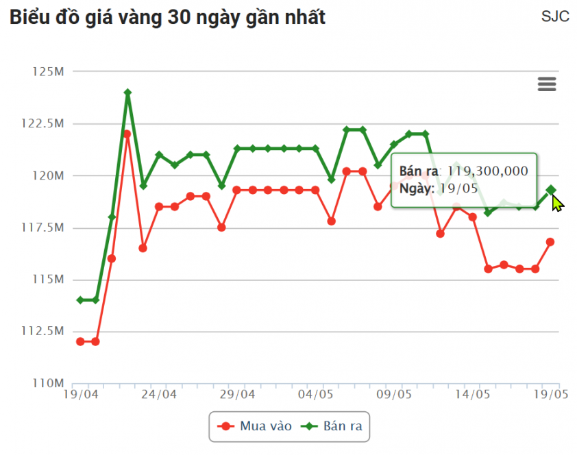 Cụ thể, Công ty Vàng bạc đá quý Sài Gòn (SJC) niêm yết giá mua vào ở mức 116,8 triệu đồng/lượng (tăng 1,3 triệu) và bán ra ở mức 119,3 triệu đồng/lượng (tăng 800 ngàn). Mức chênh lệch giá mua - bán giảm xuống còn 2,5 triệu đồng/lượng.