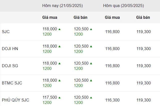Giá vàng hôm nay ngày 21/5/2025 tăng hơn 1 triệu đồng mỗi lượng. Vàng miếng SJC tiến sát mốc 120,5 triệu đồng, theo đà phục hồi của thị trường thế giới.
