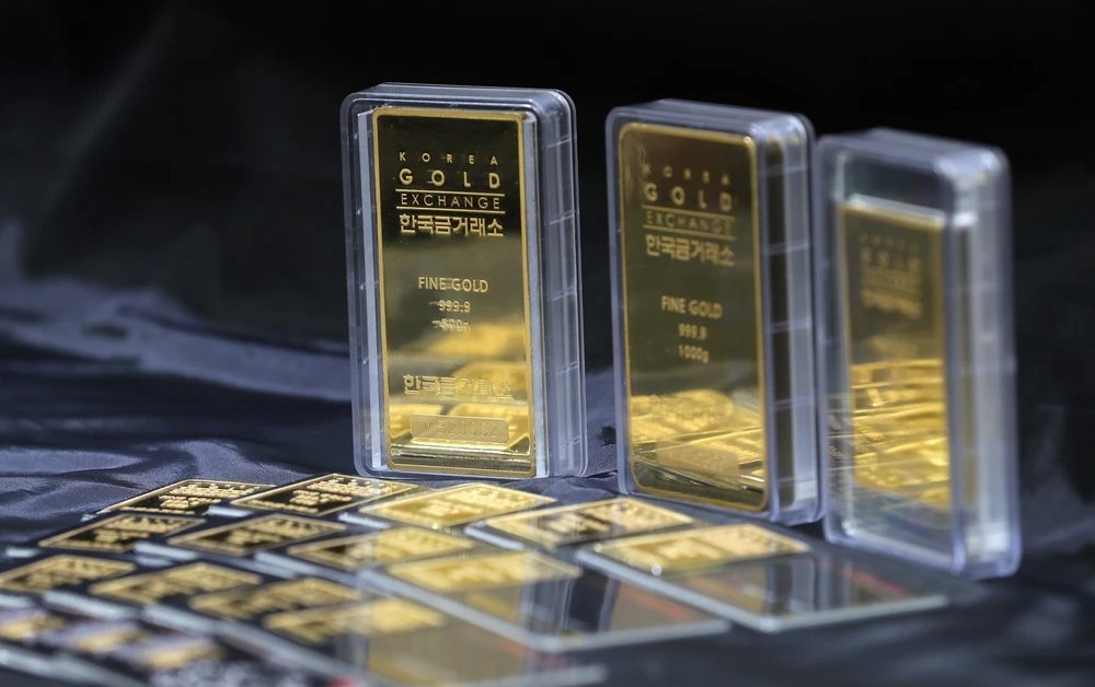 Vàng miếng được bày bán tại sàn giao dịch ở Seoul, Hàn Quốc. Ảnh: Yonhap/TTXVN