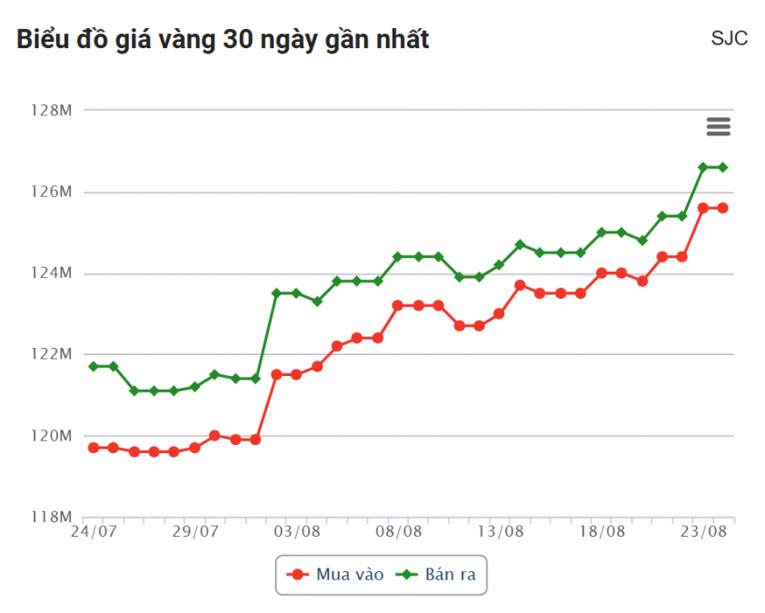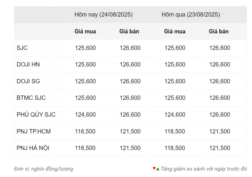 Sáng 24/8/2025, thị trường vàng trong nước tiếp tục duy trì mức cao kỷ lục. Vàng miếng SJC, DOJI và Bảo Tín Minh Châu tại Hà Nội và TP.HCM được niêm yết ở mức 125,6 triệu đồng/lượng chiều mua vào và 126,6 triệu đồng/lượng chiều bán ra, giữ nguyên so với hôm qua. Phú Quý SJC sáng nay cũng đi ngang ở mức 124,6 – 126,6 triệu đồng/lượng.