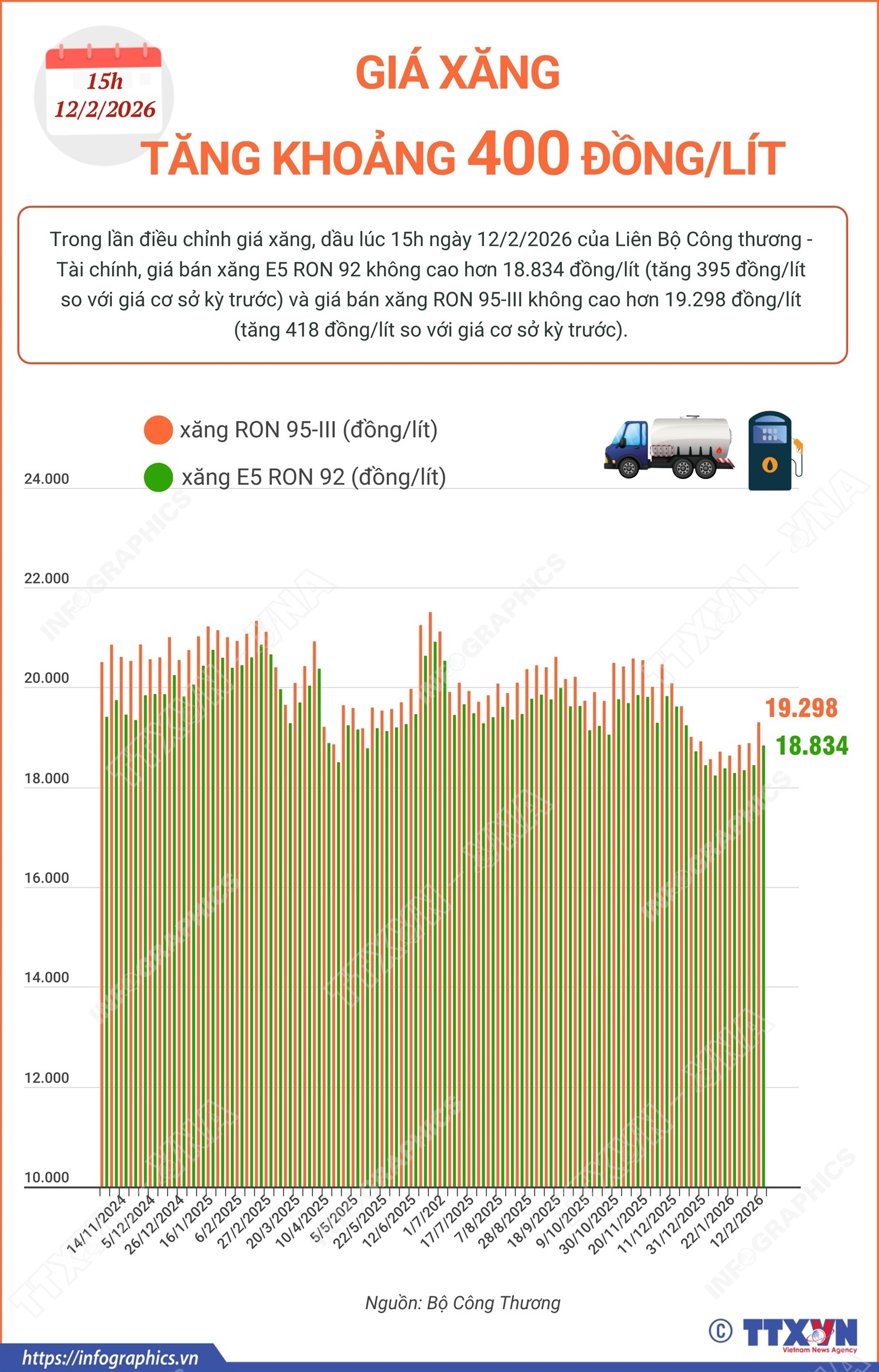 Trong lần điều chỉnh giá xăng, dầu lúc 15h ngày 12-2-2026 của Liên Bộ Công thương - Tài chính, giá bán xăng E5 RON 92 không cao hơn 18.834 đồng/lít (tăng 395 đồng/lít so với giá cơ sở kỳ trước) và giá bán xăng RON 95-III không cao hơn 19.298 đồng/lít (tăng 418 đồng/lít so với giá cơ sở kỳ trước).