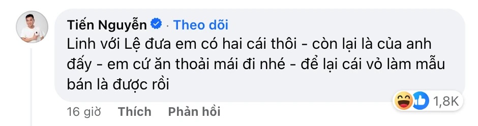 Một thành viên team châu Phi đã để lại bình luận dưới bài viết của Hằng Du Mục. Người này viết: "Linh với Lệ đưa em có hai cái thôi - còn lại là của anh đấy - em cứ ăn thoải mái đi nhé - để lại cái vỏ làm mẫu bán là được rồi".