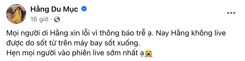 Ngoài chia sẻ về "em rọt", Hằng Du Mục còn khiến người xem lo lắng khi thông báo đang bị bệnh và phải tạm ngừng livestream. "Mọi người ơi Hằng xin lỗi vì thông báo trễ ạ. Nay Hằng không live được do sốt từ trên máy bay sốt xuống. Hẹn mọi người vào phiên live sớm nhất ạ", cô viết. Chia sẻ của nữ tiktoker khiến ai nấy đều lo lắng.