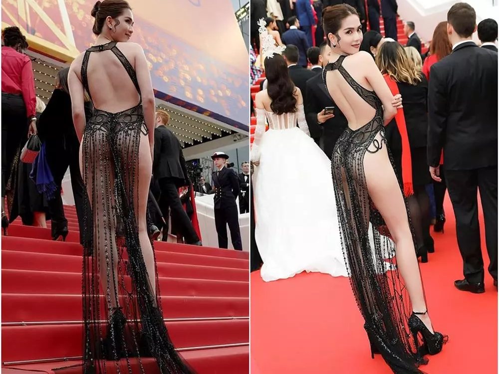 Trong sự nghiệp hở bạo của Ngọc Trinh không thể không nhắc đến lần xuất hiện tại Liên hoan phim Cannes 2019. Mẫu váy xuyên thấu có thể coi là bộ cánh khiến Ngọc Trinh bị “ném đá” nhiều nhất từ trước tới nay.