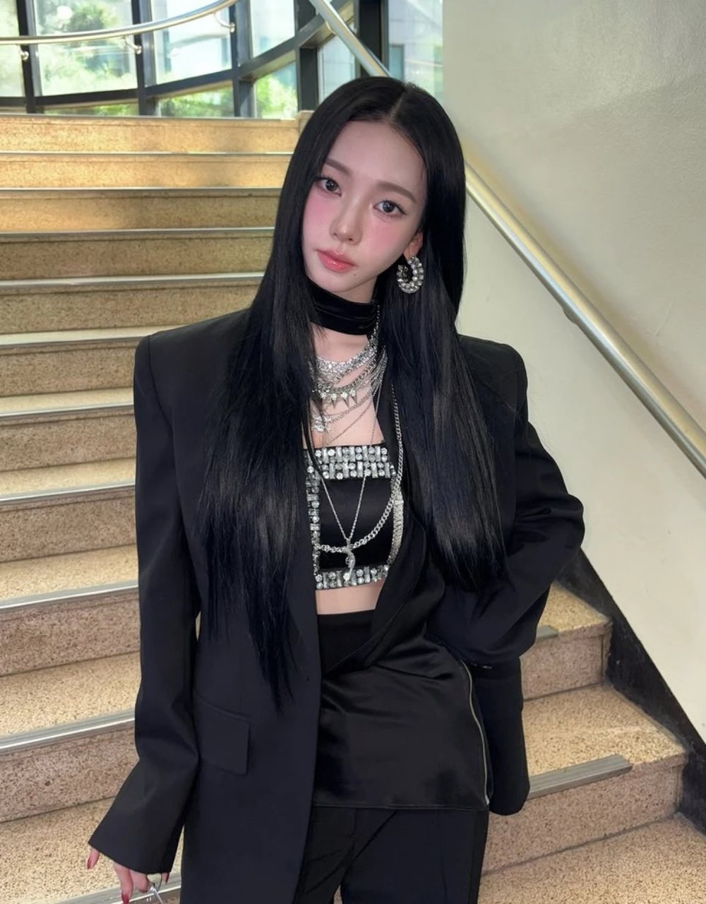 Danh xưng này được nhiều dân mạng xứ củ sâm ưu ái đặt cho Lee nhờ vẻ tương đồng trong vẻ ngoài giữa cô và thành viên Karina của nhóm nhạc aespa (phải). Cả hai đều sở hữu gương mặt trái xoan, đôi mắt to tròn, mái tóc đen dài đặc trưng và hình thể gợi cảm.