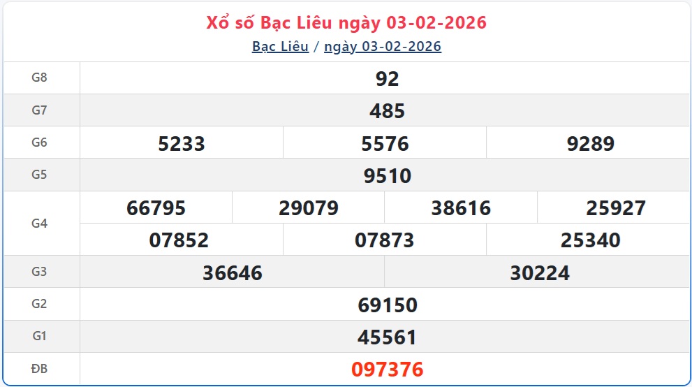 Kết quả xổ số Bạc Liêu thứ Ba ngày 3/2/2026