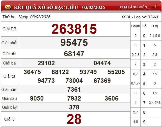 Theo dõi kết quả xổ số Bạc Liêu hôm nay 10/3/2026 nhanh chóng và chính xác nhất để không bỏ lỡ thời gian nhận thưởng.