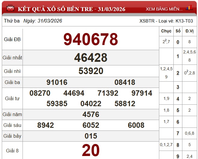 Kết quả xổ số Bến Tre ngày 31/3/2026
