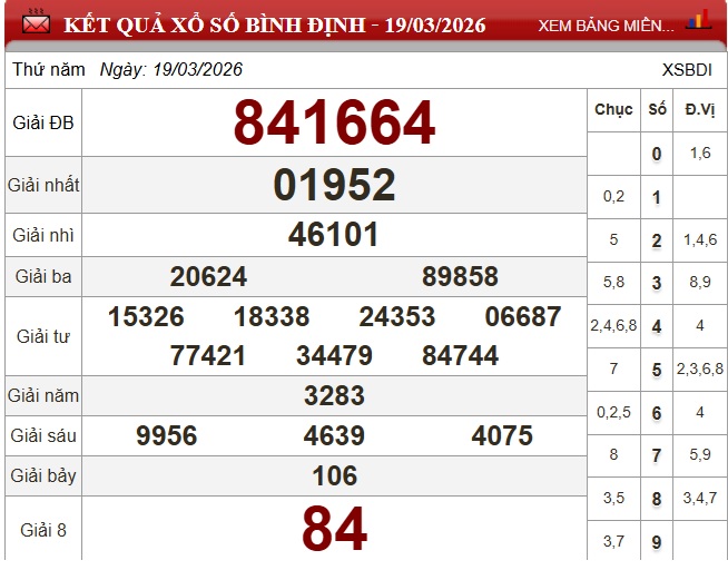Kết quả xổ số Bình Định Thứ Năm ngày 19/3/2026