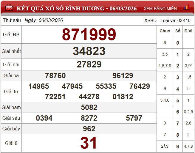 Theo dõi kết quả xổ số Bình Dương hôm nay ngày 13/3/2026 nhanh chóng và chính xác nhất để không bỏ lỡ thời gian nhận thưởng.