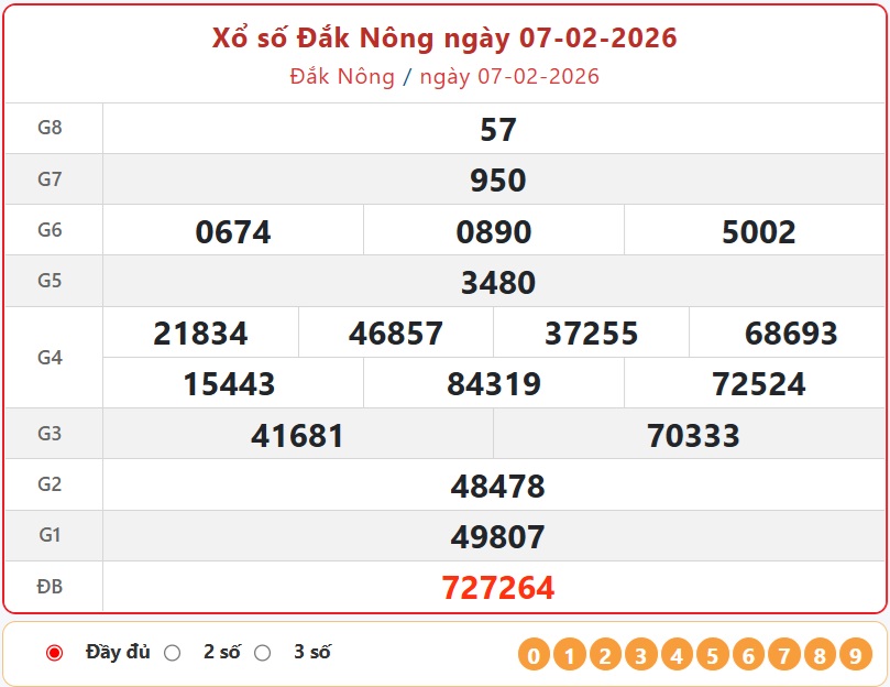 Theo dõi ngay kết quả xổ số Đăk Nông hôm nay 7/2/2026 nhanh chóng và chính xác nhất.