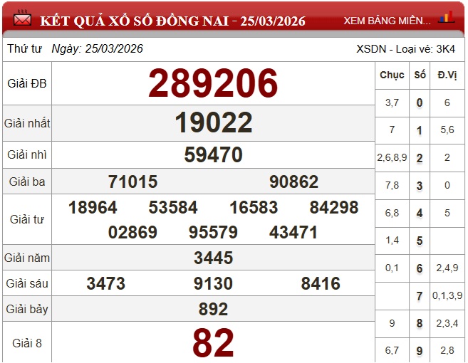 Kết quả xổ số Đồng Nai ngày 25/3/2026