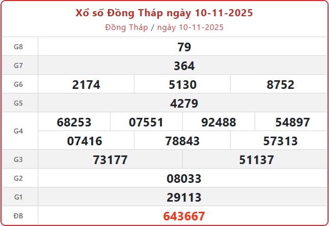 Kết quả xổ số Đồng Tháp hôm nay 10/11/2025 được quay thưởng vào lúc 16h15 bởi Công ty TNHH MTV Xổ số kiến thiết Đồng Tháp. Kết quả các giải thưởng của XSDT 10/11/2025 sẽ được công bố lần lượt từ giải nhất cho đến giải tám, cuối cùng là giải đặc biệt.