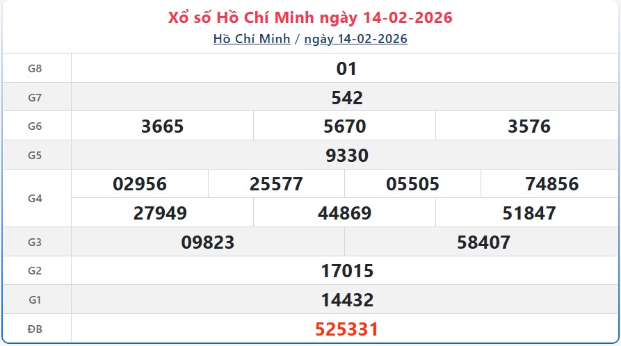 Kết quả xổ số Hồ Chí Minh ngày 14/2/2026