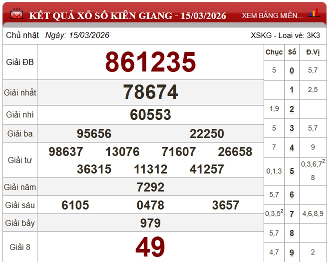 Theo dõi kết quả xổ số Kiên Giang hôm nay 22/3/2026 nhanh chóng và chính xác nhất để không bỏ lỡ thời gian nhận thưởng.