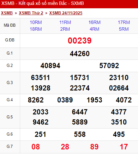 Kết quả Xổ số miền Bắc ngày 24/11/2025