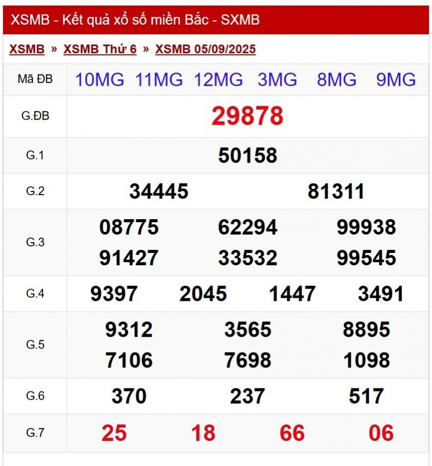 Kết quả xổ số miền Bắc ngày 6/9/2025. KQXSMB 6/9