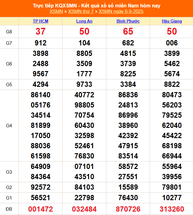 - Thứ Bảy: XSMN sôi động với 4 đài cùng tham gia: TP.HCM, Long An, Hậu Giang và Bình Phước.