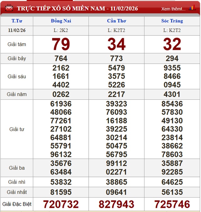 Kết quả xổ số miền Nam ngày 11/2/2026