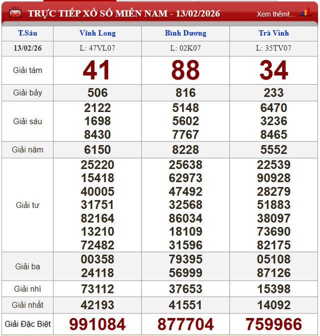 Kết quả xổ số miền Nam ngày 13/2/2026