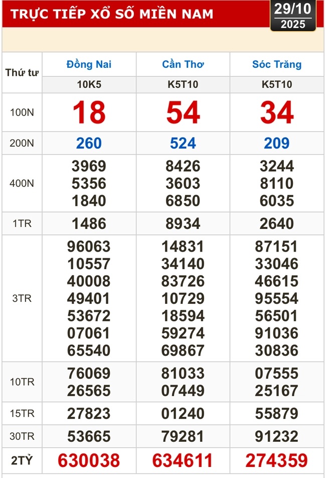 Kết quả xổ số miền Nam ngày 30/10/2025