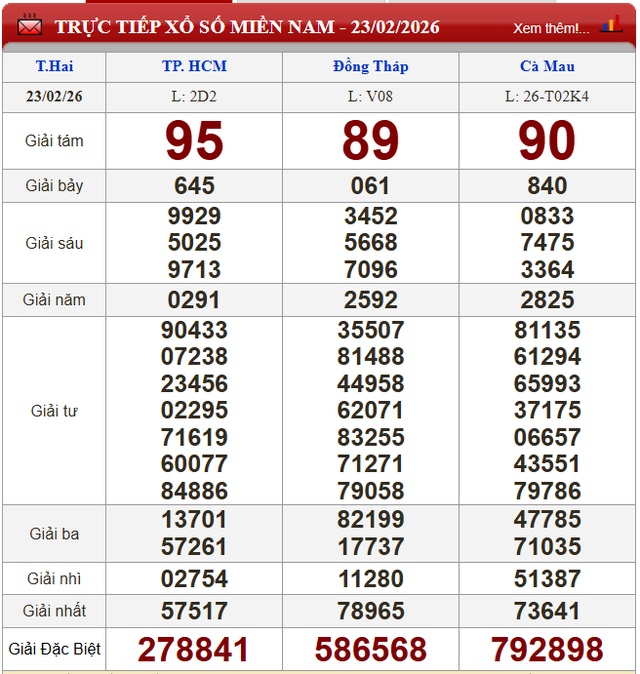 Kết quả xổ số miền Nam ngày 23/2/2026