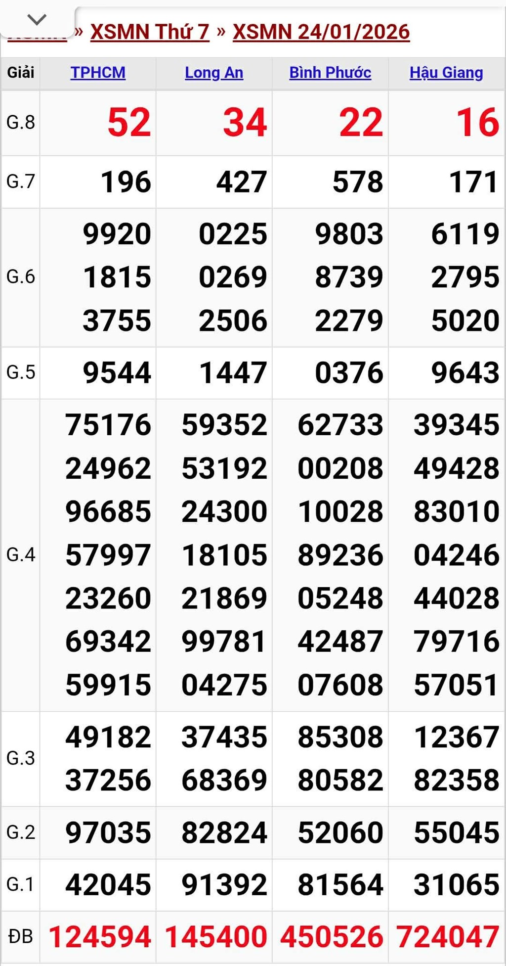 Kết quả xổ số miền Nam ngày 24/1/2026
