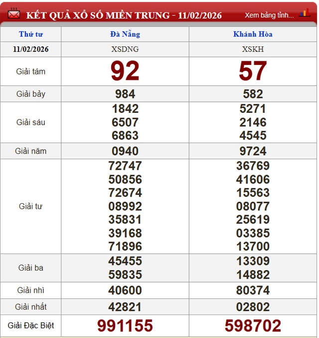 Kết quả xổ số miền Trung ngày 11/2/2026