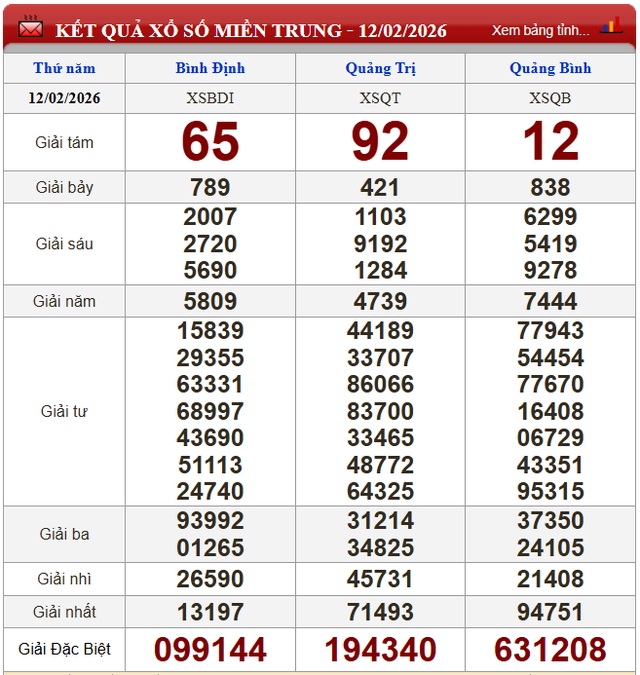 Kết quả xổ số miền Trung ngày 12/2/2026