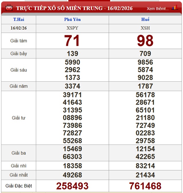 Kết quả xổ số miền Trung ngày 16/2/2026