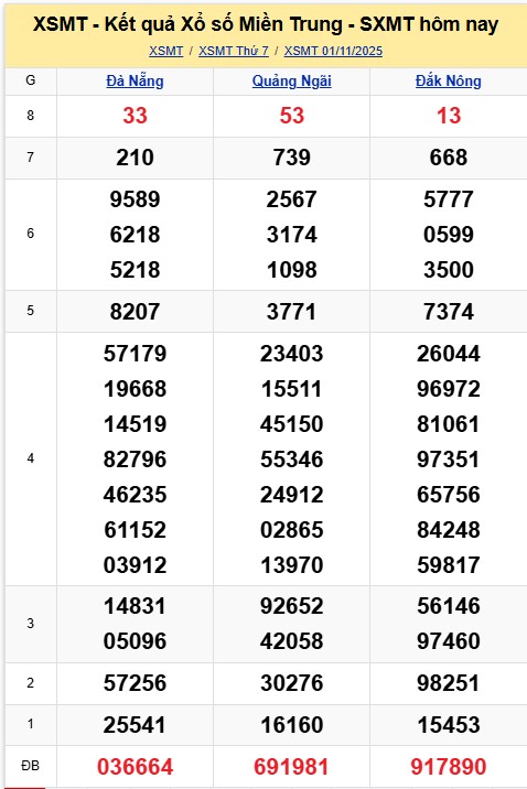 Kết quả xổ số miền Trung ngày 1/11/2025