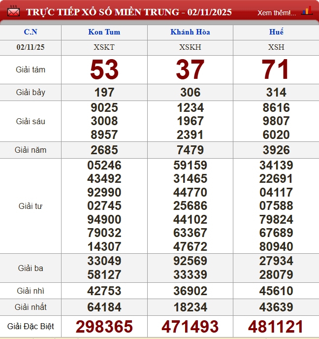 Kết quả xổ số miền Trung (XSMT) được thực hiện lúc 16 giờ 30 phút và được mở thưởng bởi Công ty xổ số kiến thiết của tỉnh Khánh Hòa (XSKH), Kon Tum (XSKT). Kết quả của đài nào sẽ được mở thưởng tại trường quay của tỉnh đó. Xổ số hôm nay - KQXSMT ngày 2/11 được quay thưởng bắt đầu từ giải tám cho đến giải nhất, cuối cùng là công bố kết quả giải đặc biệt.