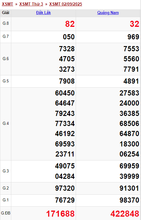 - Thứ Ba: Kết quả xổ số miền Trung (XSMT) mở thưởng bởi 2 đài Đắk Lắk (XSDLK) và Quảng Nam (XSQNA).